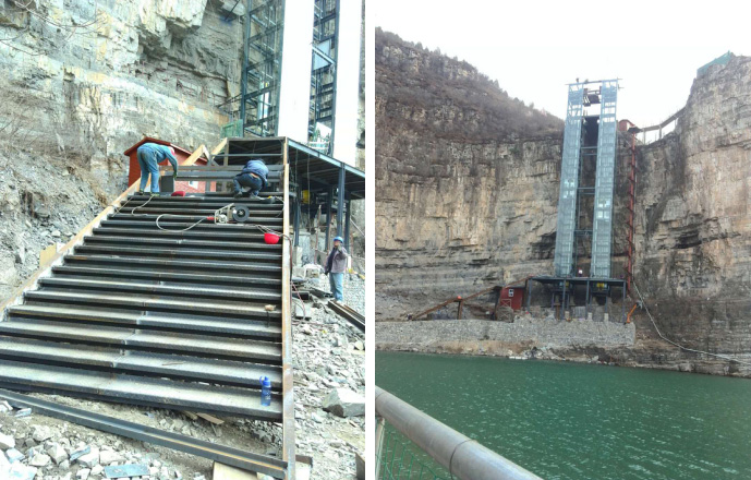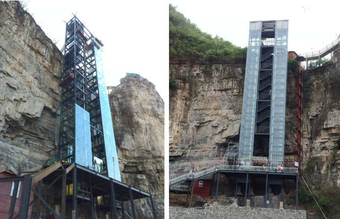 北京市房山區十渡龍湖灣景區鋼結構雙峰觀光電梯,運行高度68米,運行承重量1.6噸,承載人員23人,于2015年10月開工,2016年4月1日投入使用。