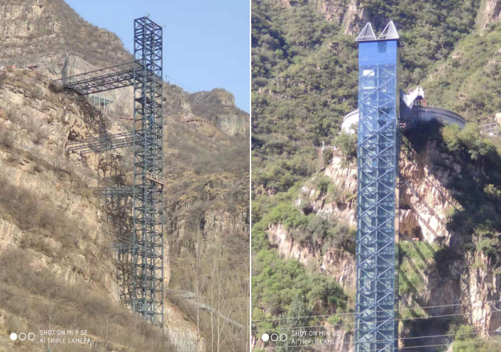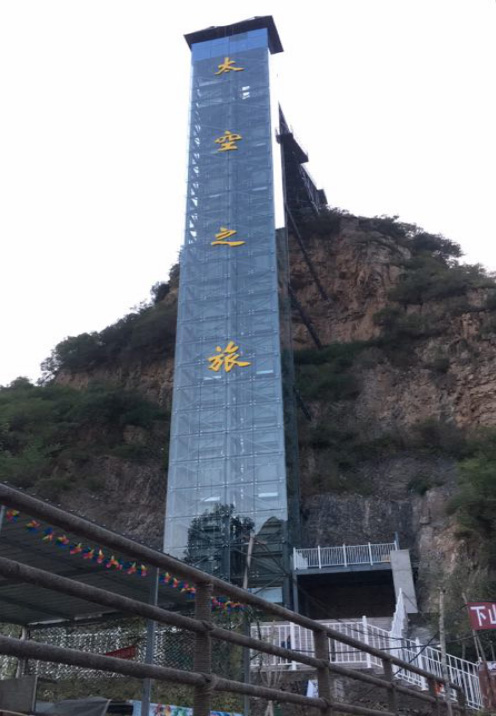 河北省保定市野三坡清泉山景區鋼結構電梯,運行高度80米,運行承載重量1.6噸,運行承載人數22人。于2018年11月開工,2019年投入使用。
